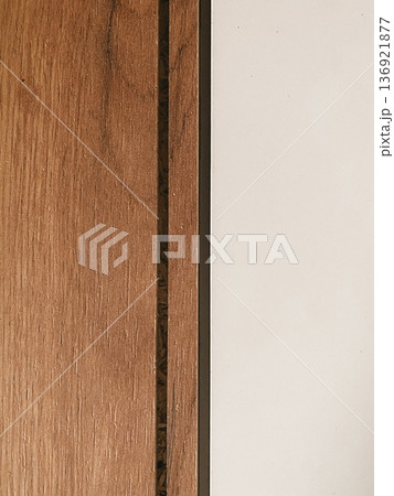 Closeup of joint between brown wooden panel and white surface, detail in interior design. Decorative background, construction and renovation, natural material