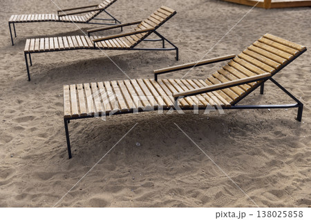 empty sun beds on the beach at the beginning of autumn in Europe in cold weather, garbage in the sand on the beach near wooden sun beds