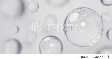 グレーの背景に複数の水滴。ジェル。背景素材。3D(横長)