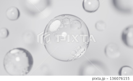 グレーの背景に複数の水滴。ジェル。背景素材。3D(横長)