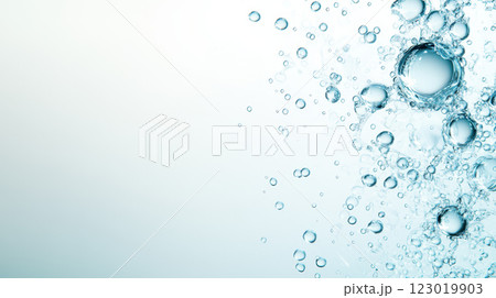 青背景に複数の水滴の背景素材。コピースペース。3D(横長)