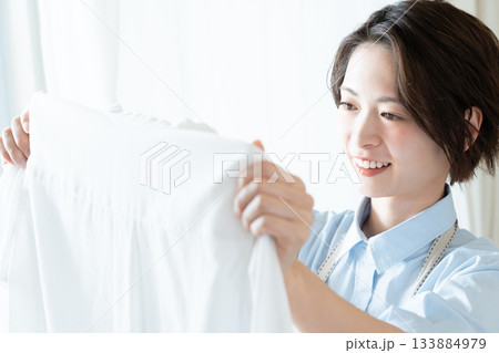 ほこり取り,ウールダスターで収納棚の埃を払う女性の手元