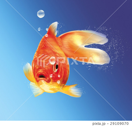 Gold fish facing the viewer, with some water bubbles, on blue gradient background.