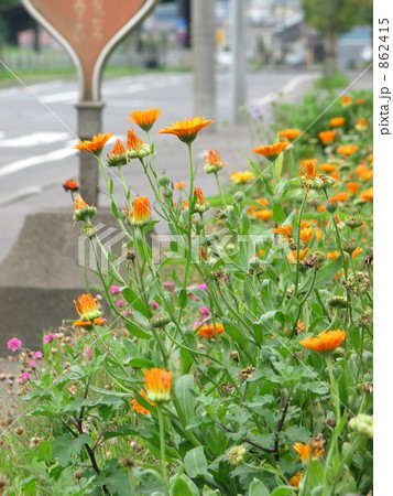 キンセンカの咲くバス停