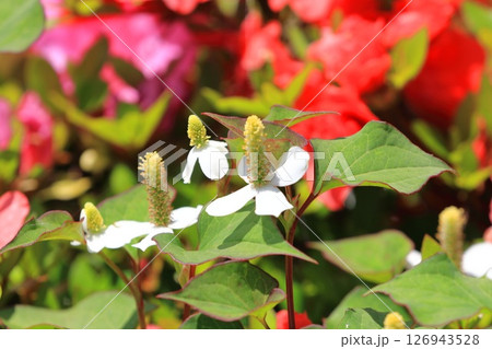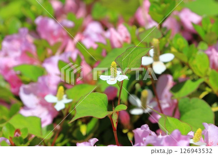 ドクダミの花と赤い縁取りの葉