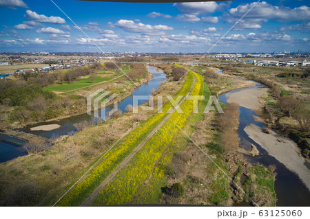入間川・小畔川・越辺川の堤に咲く満開の菜の花 埼玉県川越市 (ドローンによる空撮)