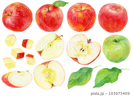 水彩で描いた様々なリンゴのイラスト リンゴの断面や青りんごも含む素材集