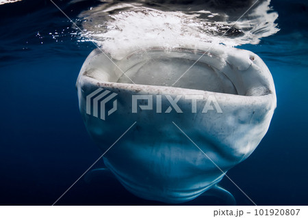 Whale shark eating in ocean near Sumbawa. Giant shark swimming underwater