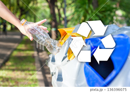 Men hands trow Trash cans for sorting garbage recycle bin waste plastic container collection. Reuse, reduce, recycle sorting process sustainable lifestyle rubbish dustbin plastic box in green garden