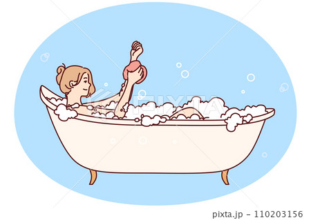 Young happy woman rubbing hand with washcloth bathing and relaxing after hard day. Vector image