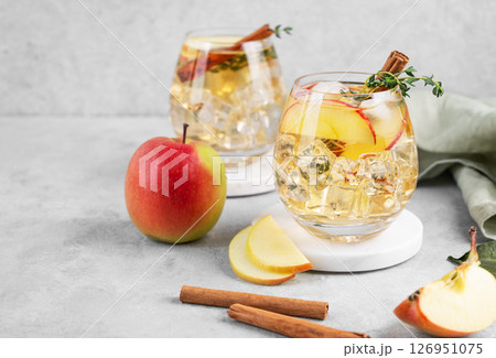 Two glasses of chilled apple cocktail or cider with ice, garnished with cinnamon and thyme