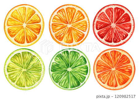 Citrus fruit slices set, orange, lemon, lime, grapefruit, tropical watercolor illustration, fresh summer fruits isolated