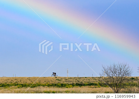 広大な河川敷の葦原と菜の花畑にかかる美しい虹の根本を走る自転車。埼玉県鴻巣市市荒川河川敷-2024年
