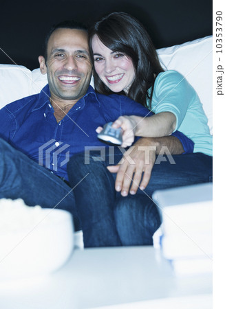 Couple watching television on sofa