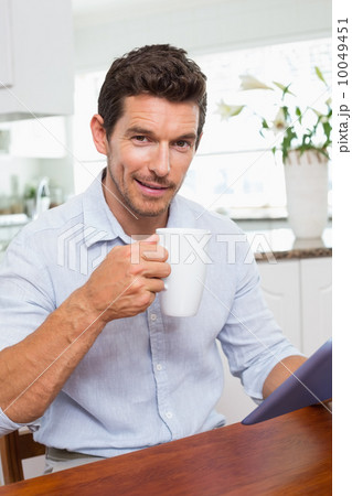 Smiling man using digital tablet while having coffeeat home