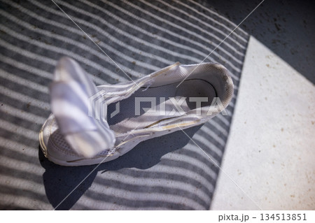 日よけシェードの陰で洗ったスニーカーを乾かす