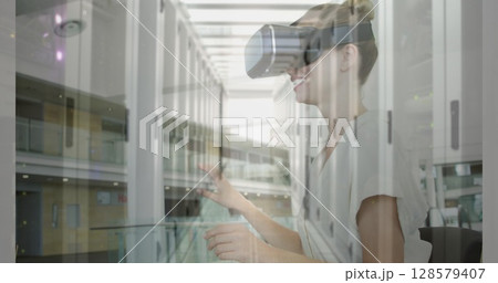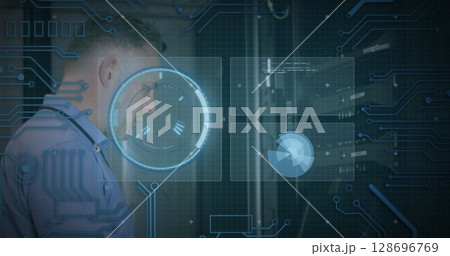 Image of scope scanning and data processing over caucasian it man fixing computer server