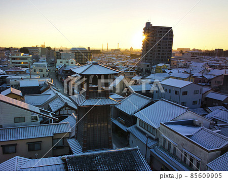 朝日に染まる雪化粧した小江戸川越蔵造りの街並み 埼玉県川越市(ドローンによる空撮)