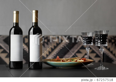 wine tasting on a table in a restaurant. glasses and bottles with empty etiquette for breadboard, appetizer.
