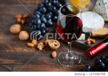 Cheese plate with grapes, honey, nuts and red wine on a wooden table, toned image.