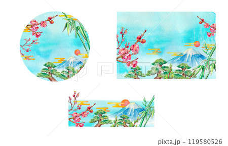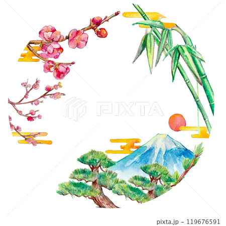 水彩で描いた富士山と松竹梅のフレーム