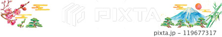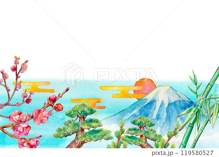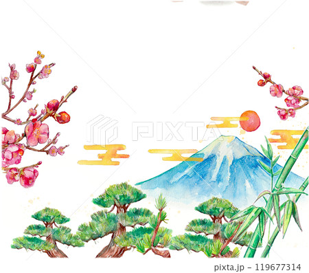 水彩で描いた松竹梅と富士山の背景