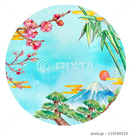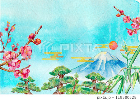 水彩で描いた富士山と松竹梅の背景