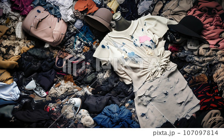 社会問題、廃棄された大量のアパレル製品のイメージ、AI画像