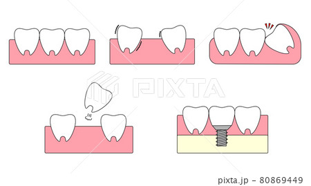 歯肉付きの歯のイラスト。健康な歯やぐらついている歯、抜け落ちている歯、インプラント。