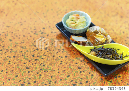 [国内] 小皿の入ったヒジキ,煮こごり,薩摩揚げとポテトサラダ。