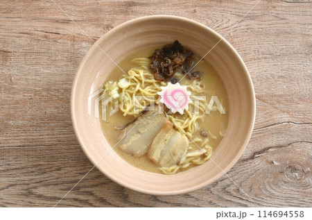 Tonkotsu ramen or Japanese yellow noodles topping slice barbecue pork in Miso soy sauce bone soup on bowl