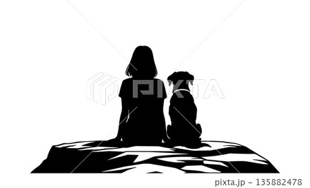 Black silhouettes of a woman and a dog sitting on a mountain peak from the back, without background.