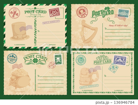 St Patrick day antique postcards, retro postage mail and vintage mail and stamps. Vector Irish holiday blank background templates with shamrock clover leaves, ornaments, place for address and text