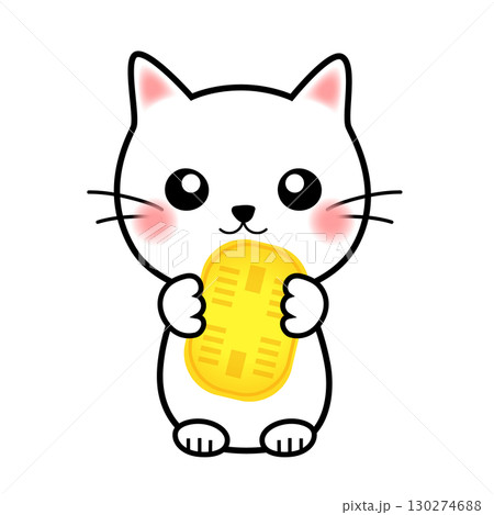 猫に小判:実は猫も小判をもらって大喜び。金ぴかの小判を猫にプレゼント。喜びのあまり呆然としている。
