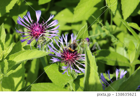 A dark bumblebee collects nectar from mountain cornflowers with buds