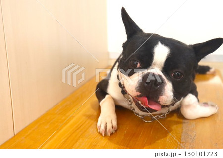 ロビーに伏せて可愛く見つめるボストンテリアのマイティ君♡