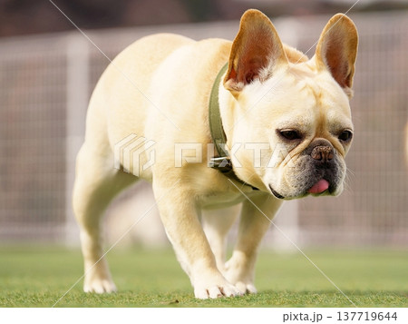 ドックランの芝生で遊ぶボストンテリアのマイティ君