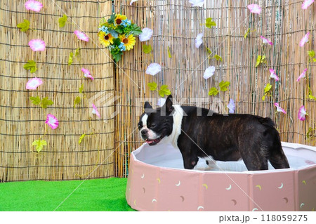 朝顔の花とカラーボールが可愛いプールに入って涼んでいるボストンテリアのマイティ君♡