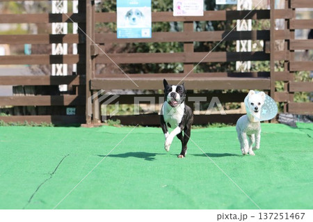 ドックランで遊ぶボストンテリアと白いトイプードル