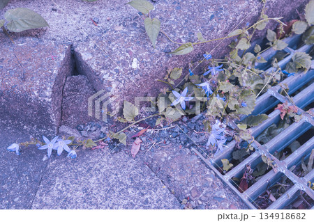 道路脇の排水溝周りに咲く雑草化したカンパニュラの花のレトロな雰囲気の写真