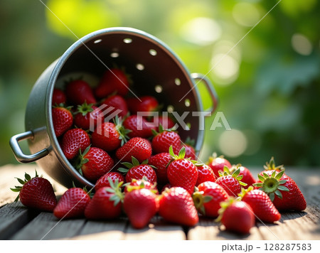 Macro Close-up of Fresh Strawberries Spilling from Colander on Rustic Table