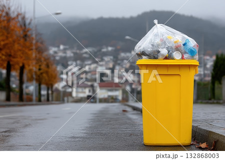 Yellow trash bin filled with sorted plastic waste set against a rainy background