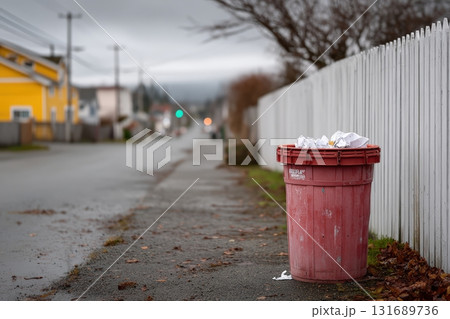 Bright red trash bin sits on a quiet street during a cloudy afternoon
