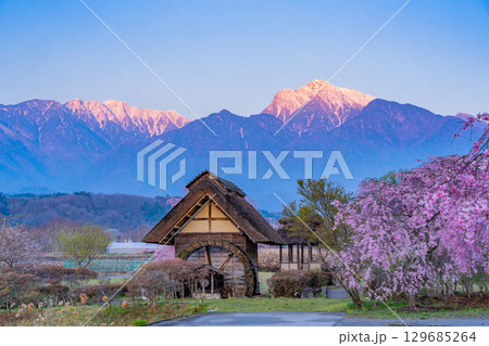 【山梨県北杜市武川町】水車の里公園 桜と水車と南アルプス 夜明け
