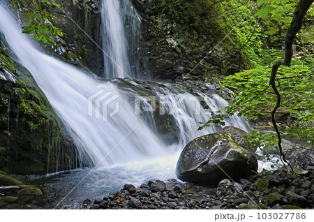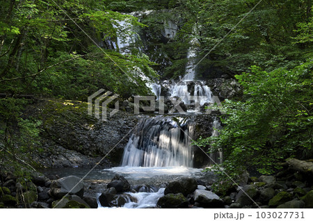 こもれびの滝の前衛滝と白川の流れ(長野県木曽郡木曽町)