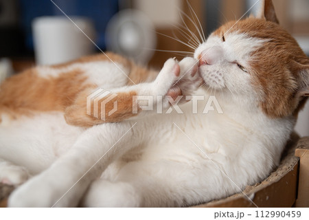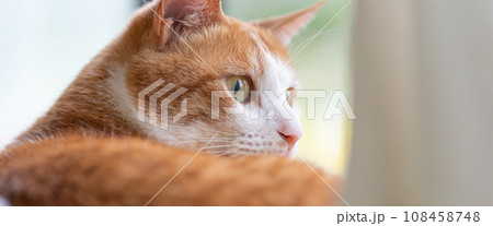 窓辺でくつろぐ眼鏡をかけた猫 茶トラ白