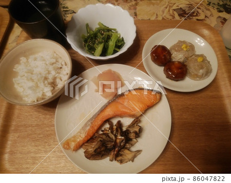 鮭の塩焼き、れんこんと長いものバルサミコ酢焼き