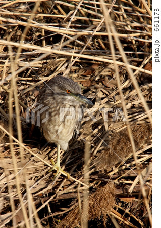 隠れるホシゴイ(ゴイサギの幼鳥)