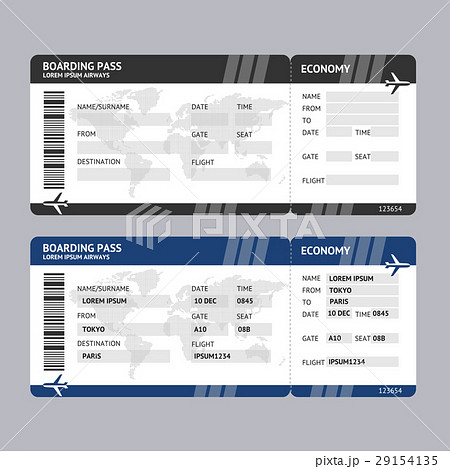 Air ticket in simple style isolated on white background. Blue boarding pass with bar code and airplane silhouette. Travel concept vector flat illustration