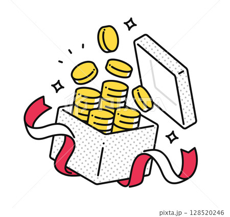 蓋が開いたプレゼント箱と山積みのコインのシンプルなベクターアイコンイラスト